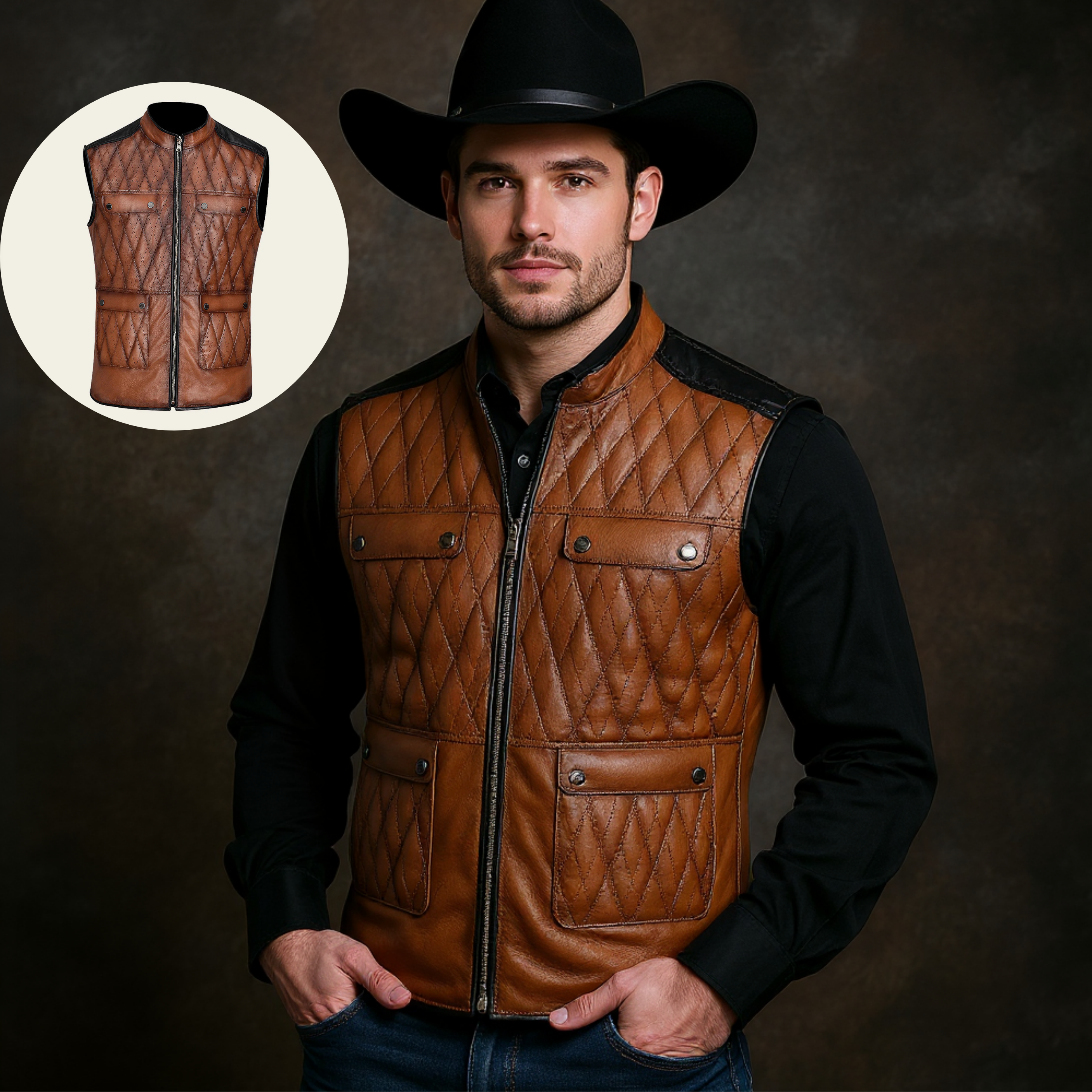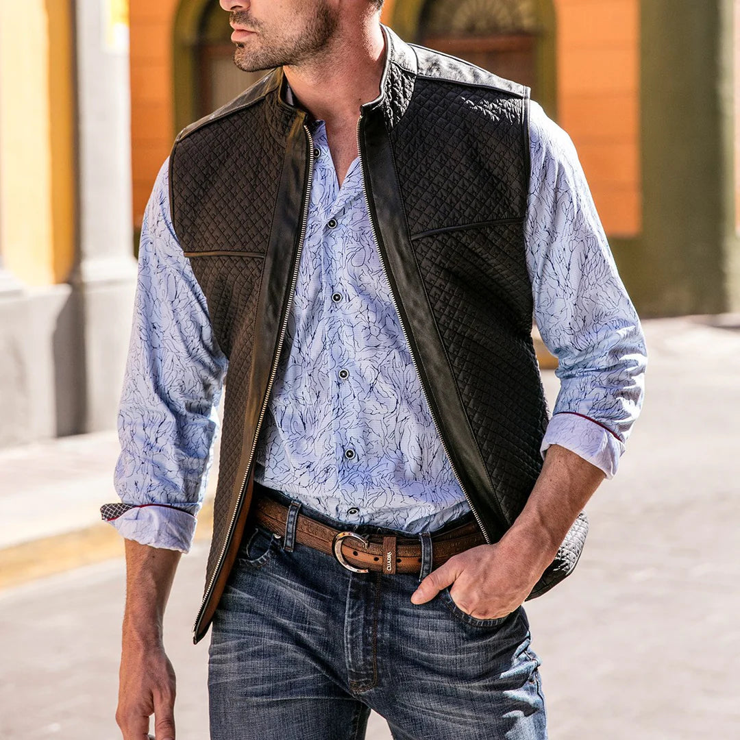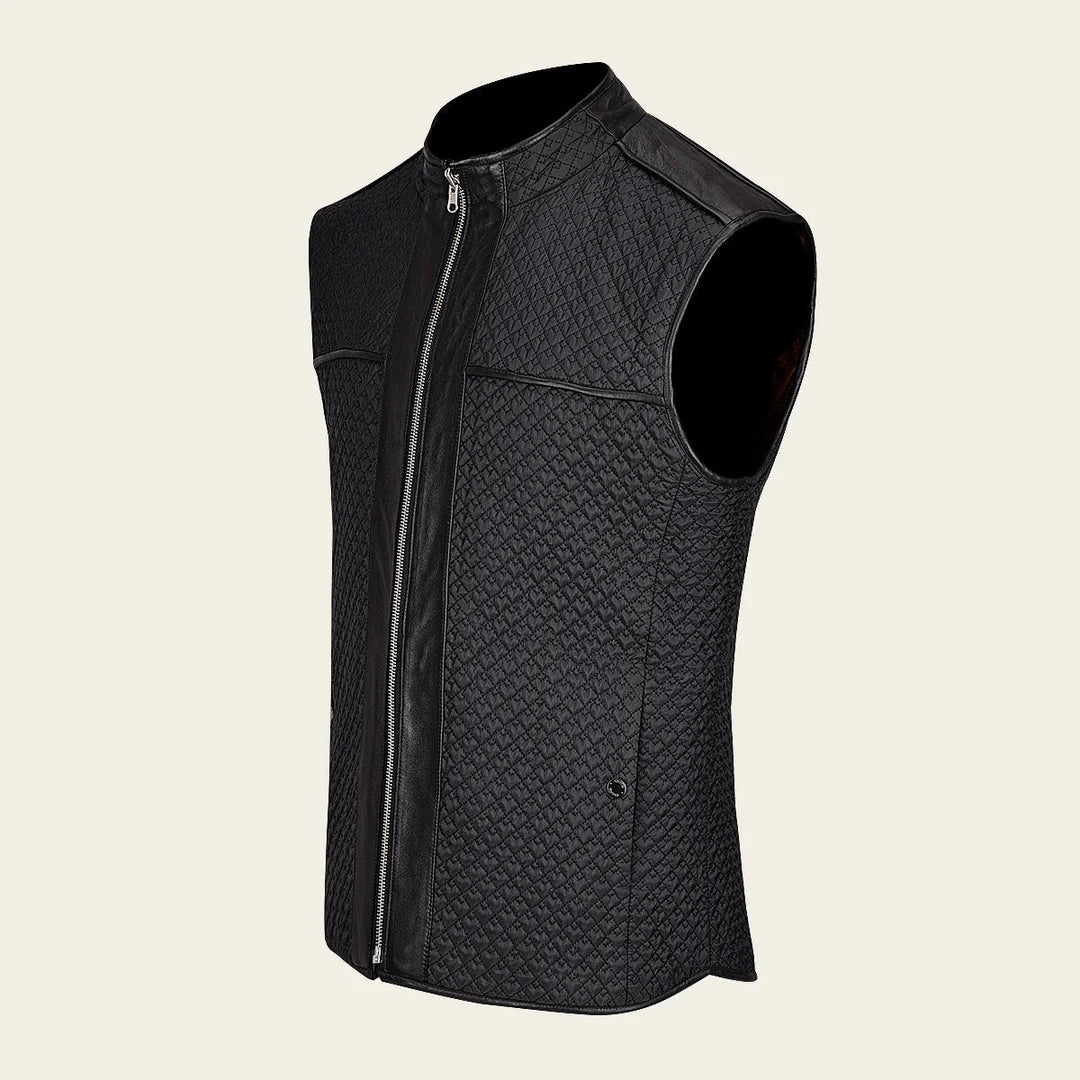 Chaleco doble vista para caballero en piel de ovino. En la vista principal presenta bordado capitonado con bolsillos decorativos al frente y dos bolsillos laterales. En la segunda vista con textil capitonado con bolsillos laterales asegurados con broches de presión. Ajustado con cierre frontal.