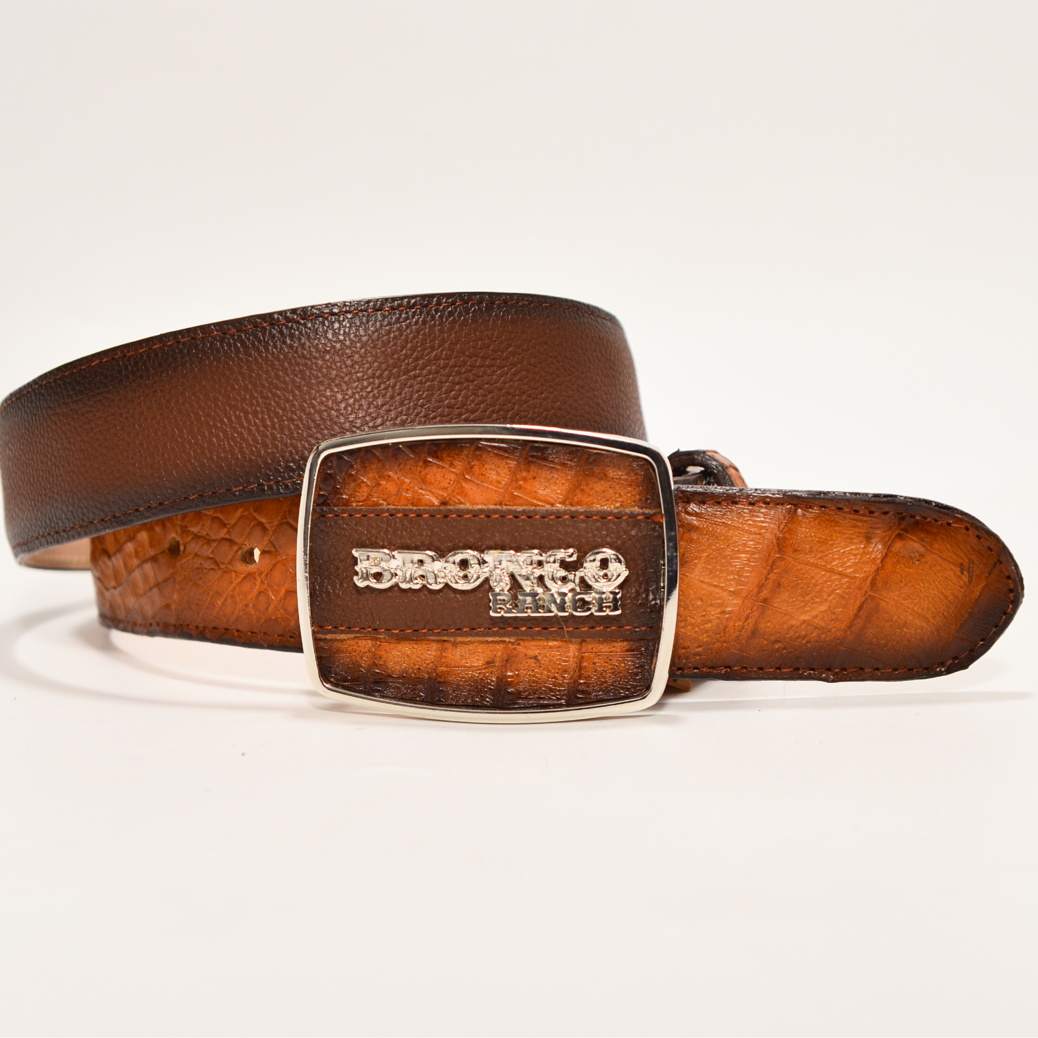Hebilla metálica personalizada: Con el logo “BRONCO RANCH” grabado sobre piel cocodrilo.