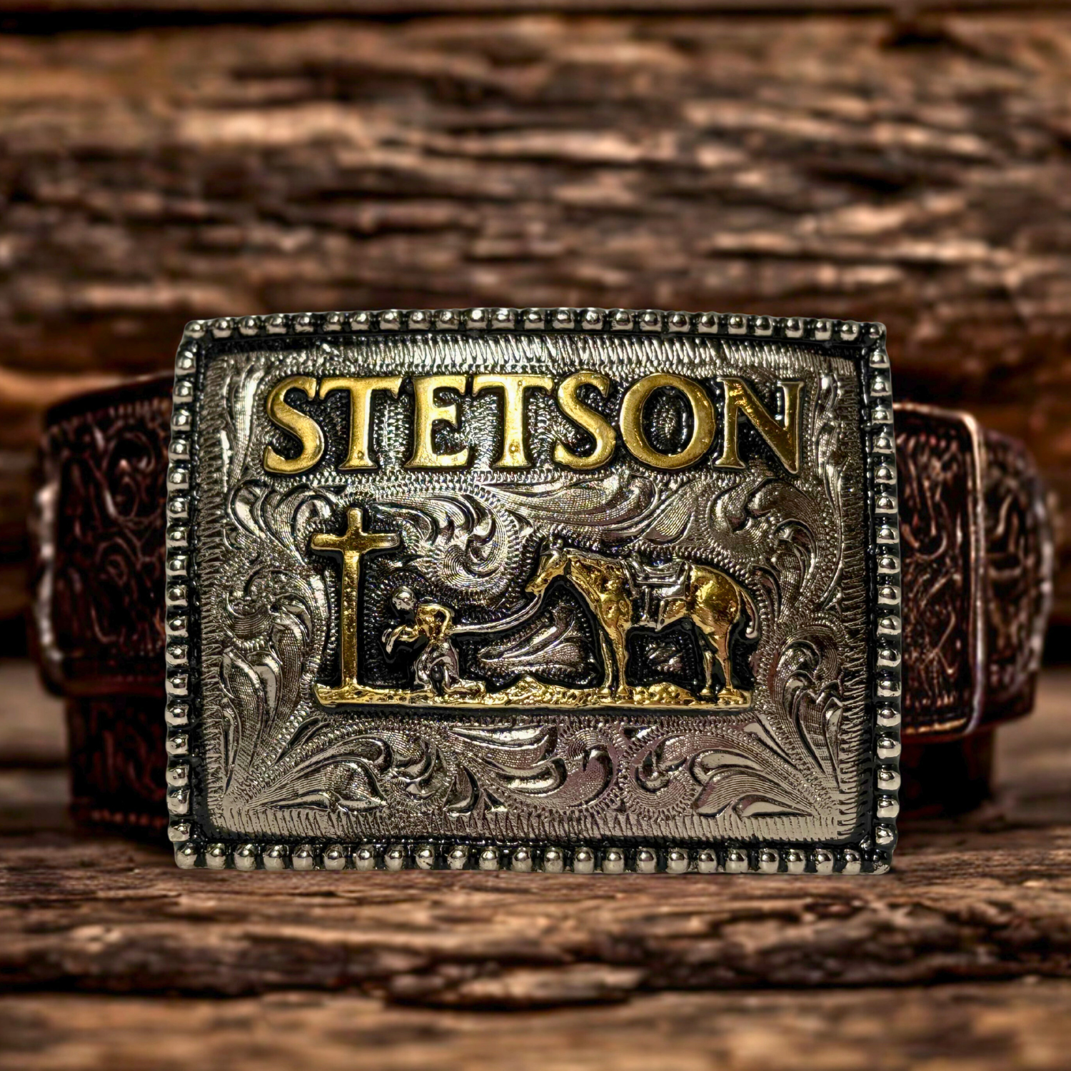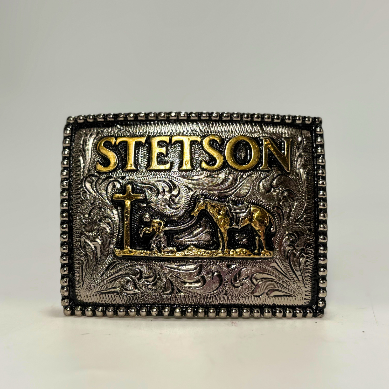 Hebilla vaquera metálica con detalles grabados en relieve, bordes con acabado perlado y el nombre "STETSON" en letras doradas. Incluye una escena dorada con un jinete arrodillado frente a una cruz y un caballo, representando un momento de oración o reflexión.