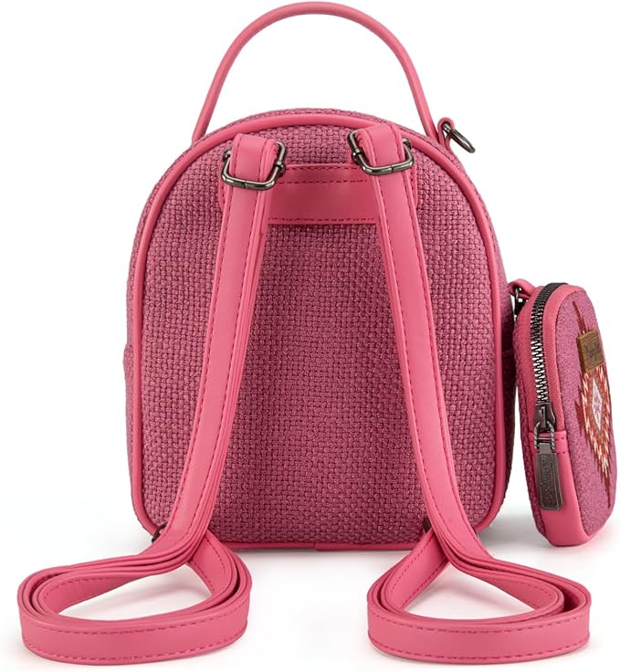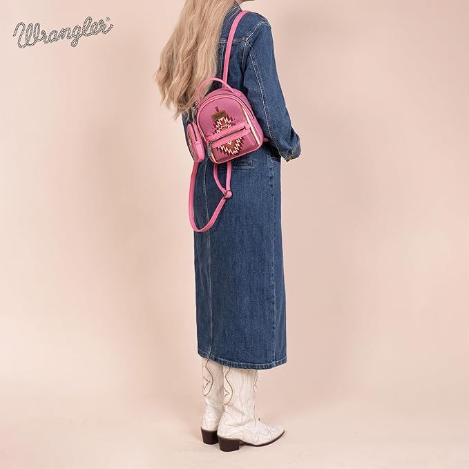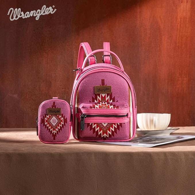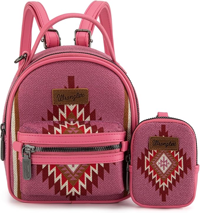 Dale un toque vibrante y auténtico a tu estilo con esta mini mochila Wrangler para mujer, que incluye un monedero a juego. Con un llamativo diseño tribal étnico en tonos rosados, rojos y detalles en blanco y marrón, esta pieza es perfecta para quienes buscan un look western moderno, boho y lleno de personalidad.