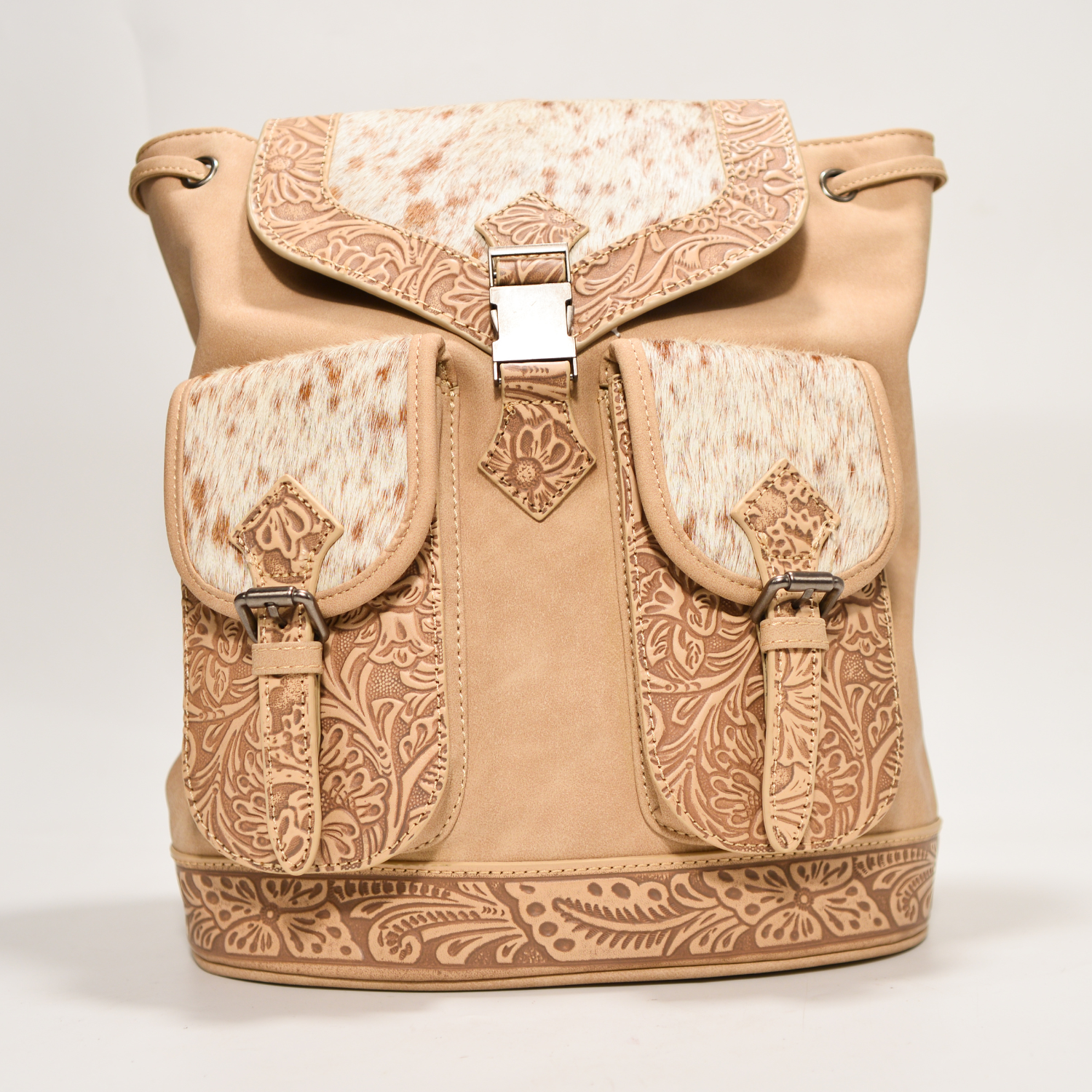 Mochila Vaquera Artesanal de Piel con Pelo Natural y Grabado Floral