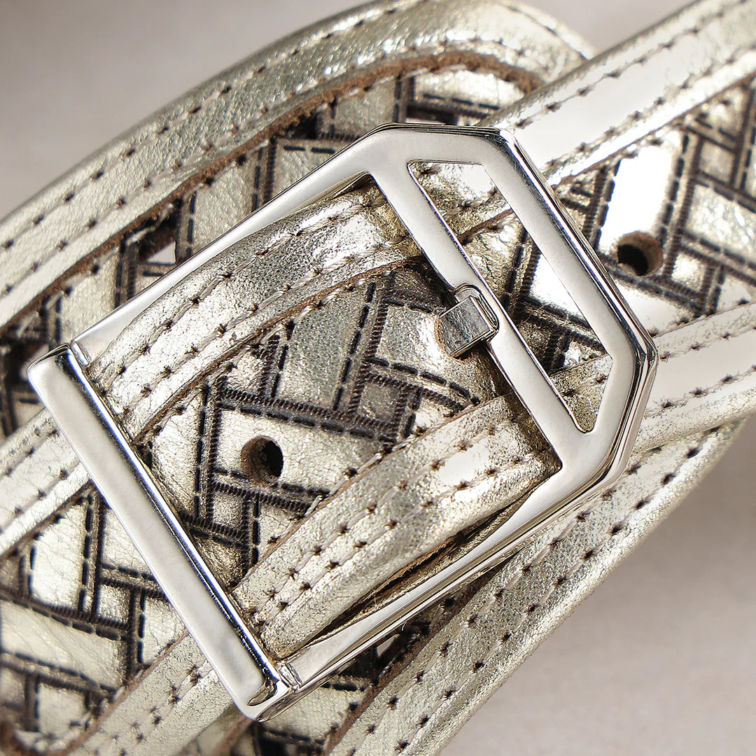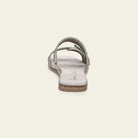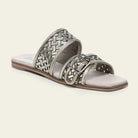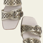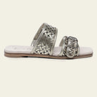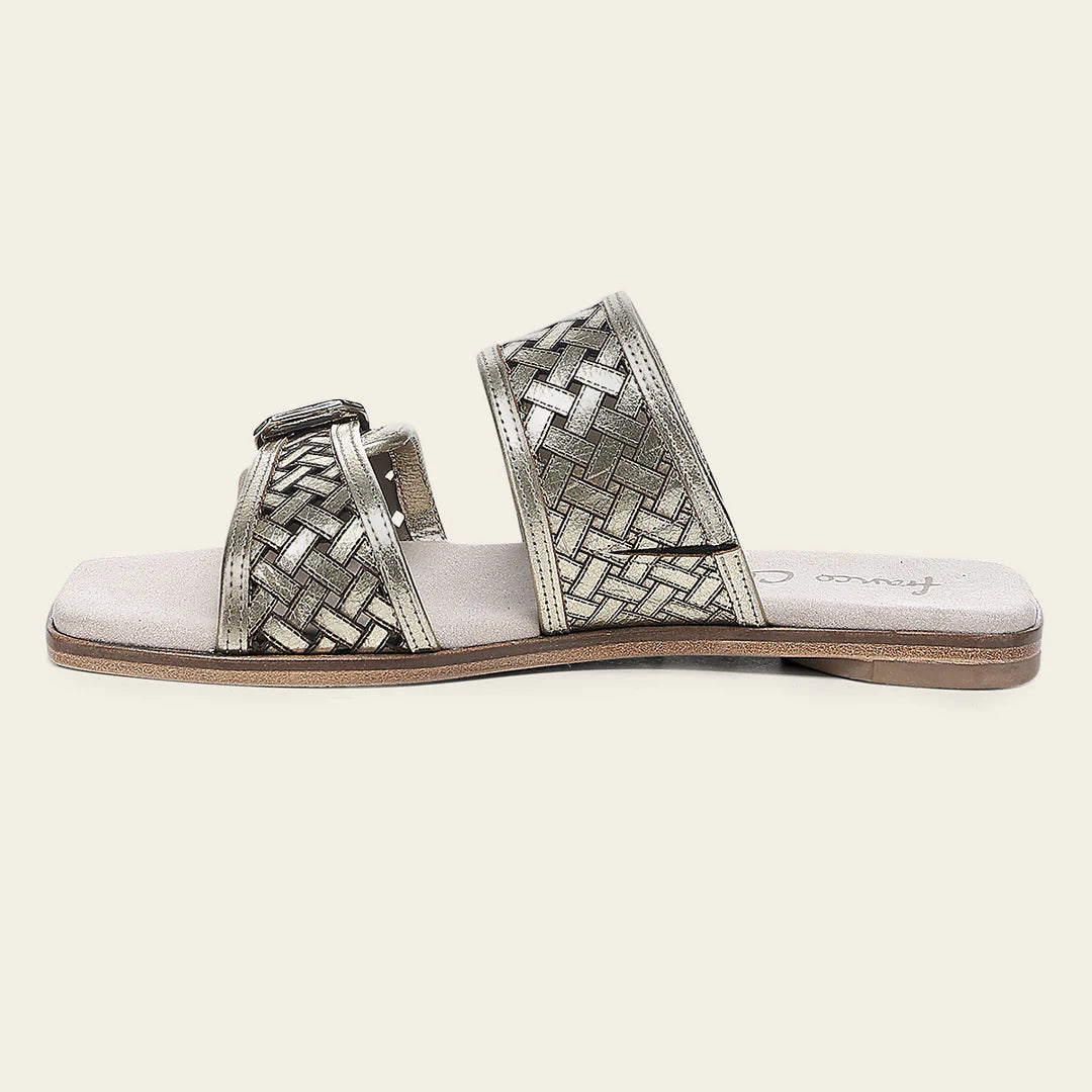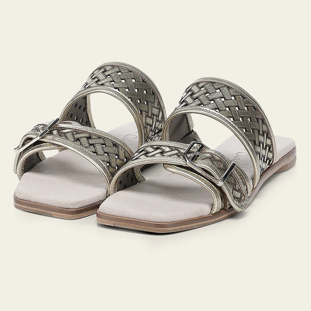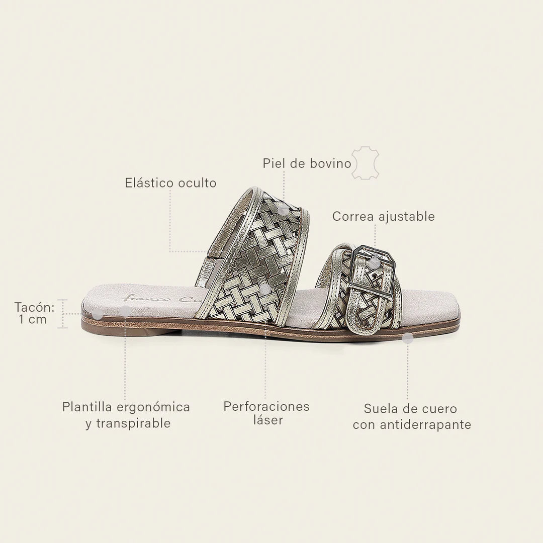 Sandalia para dama en piel genuina de bovino. Presenta perforado láser que simula tejido, ajuste de doble correa: una de ellas sujeta con hebilla y la de mayor tamaño con elástico oculto para mejor ajuste.
