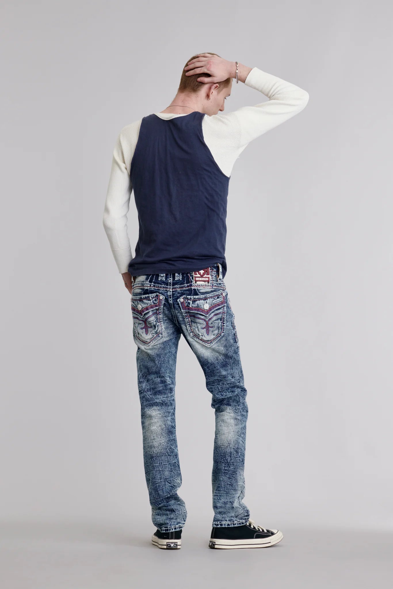 Haz una declaración de estilo audaz con estos Rock Revival. Este modelo destaca por su acabado intensamente texturizado y sus icónicos detalles de costura en contraste rojo, ofreciendo un look rebelde, moderno y de alta gama.