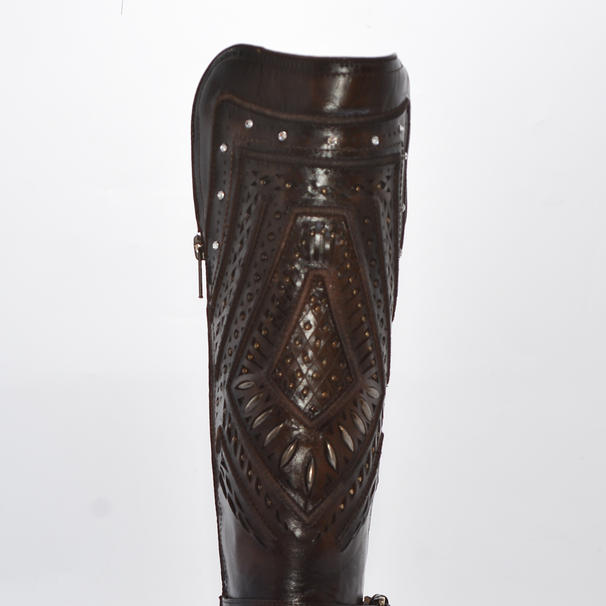 La caña alta presenta un calado láser geométrico con aplicaciones de pedrería y cristales, creando un diseño lujoso y brillante.