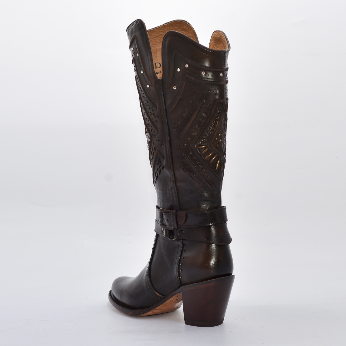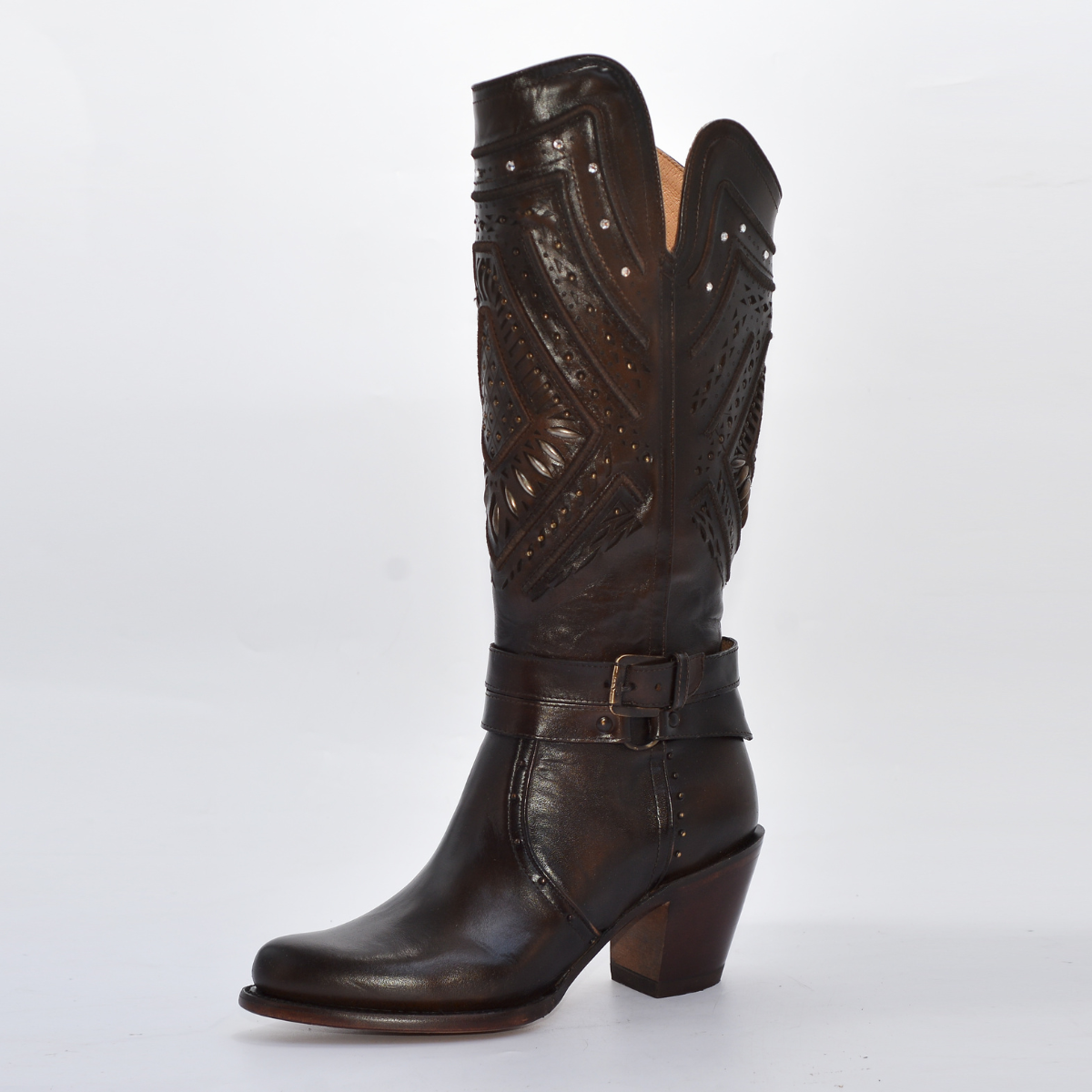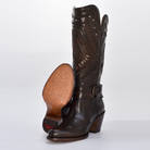 Una bota de alta moda y diseño espectacular, ideal para la dama que busca un calzado western que combine la elegancia de un tacón alto con detalles únicos.