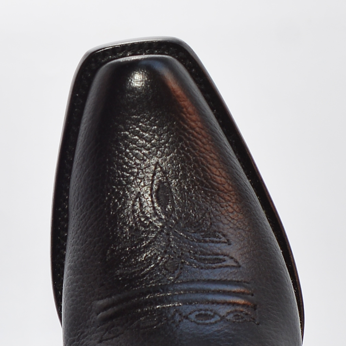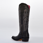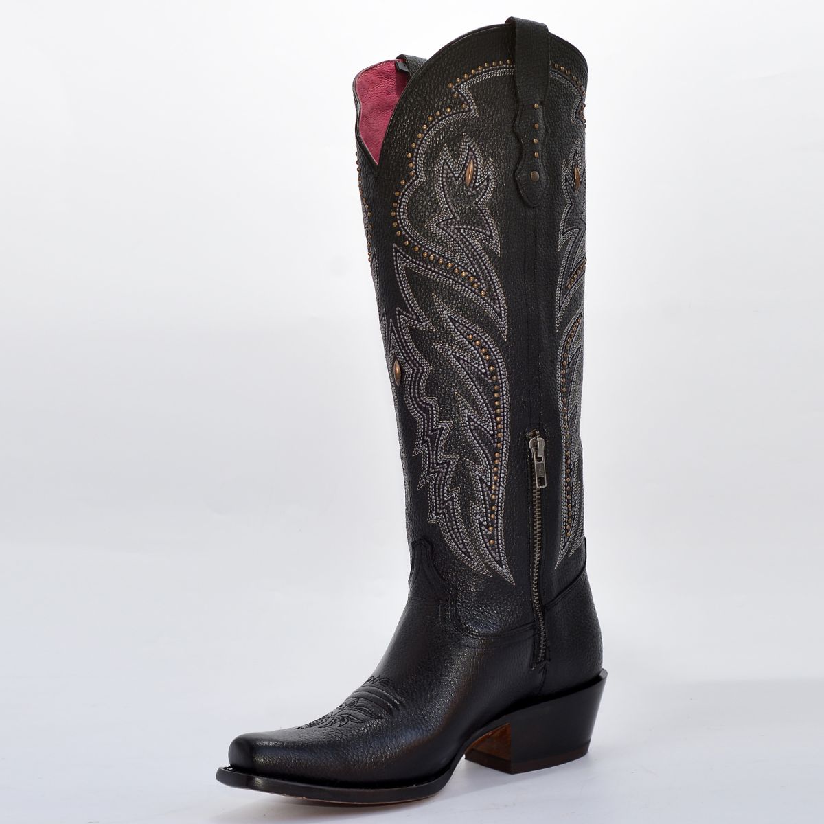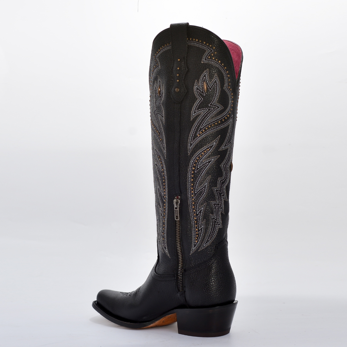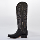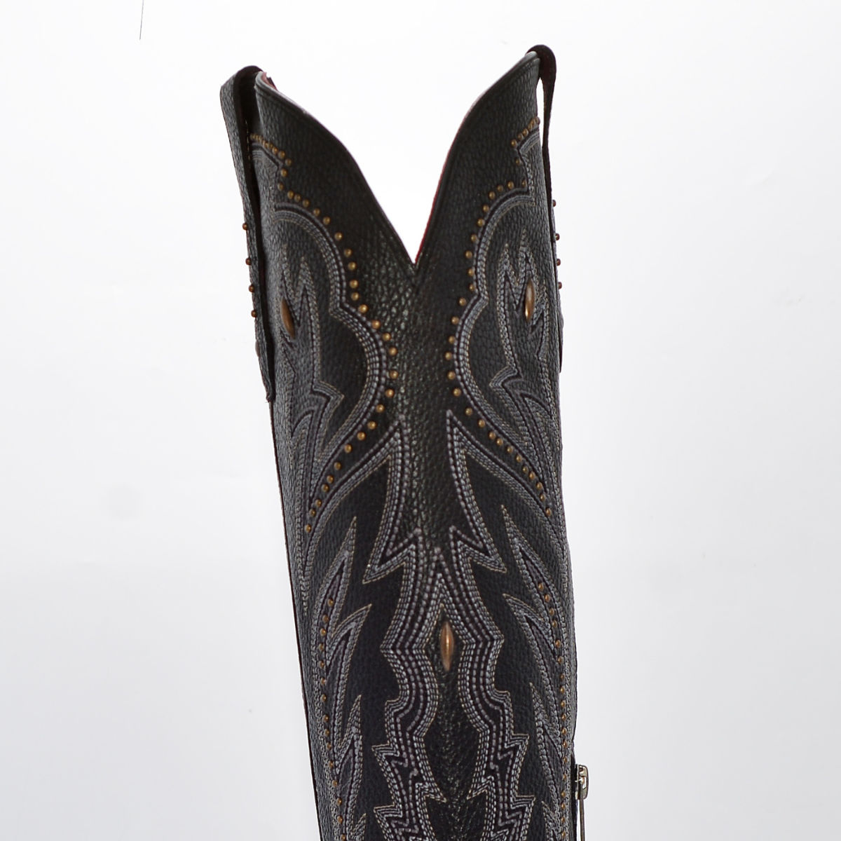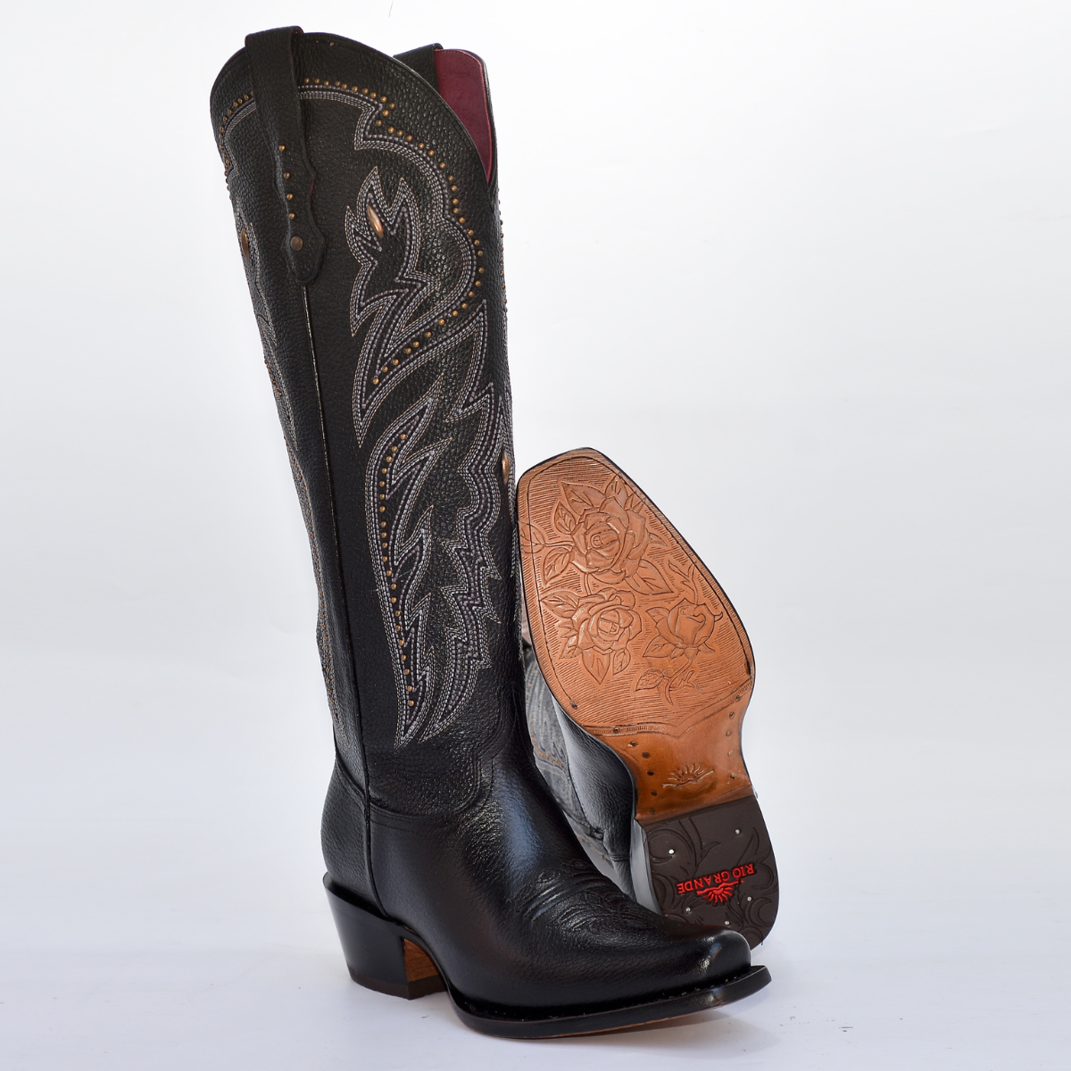• La caña alta presenta un bordado tipo western con efecto tridimensional y está adornada con aplicaciones metálicas (estoperoles), destacando el contraste sobre el fondo negro.