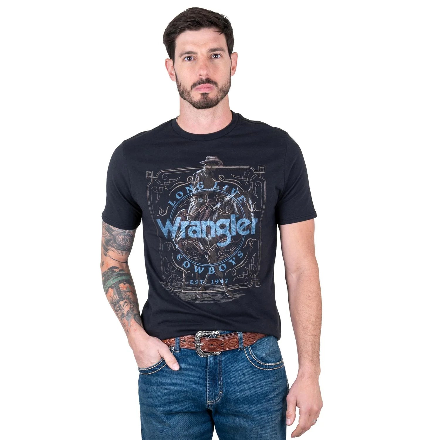 Gráfico Frontal Distintivo: Presenta el icónico logotipo de Wrangler en letras grandes con un acabado texturizado que resalta sobre el fondo negro.