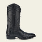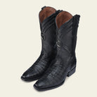 Bota rodeo para caballero en piel genuina de lomo fuscus negro. Sobre el tubo presenta bordado, grabado láser de logotipo Cuadra y aplicación de hule de logotipo Cuadra al frente.