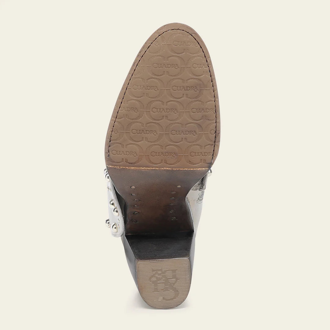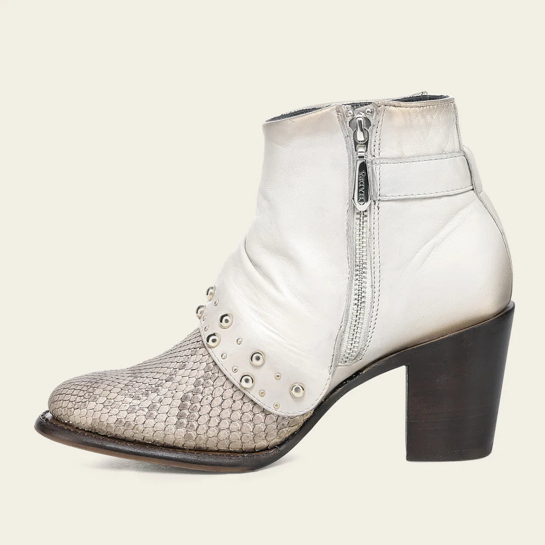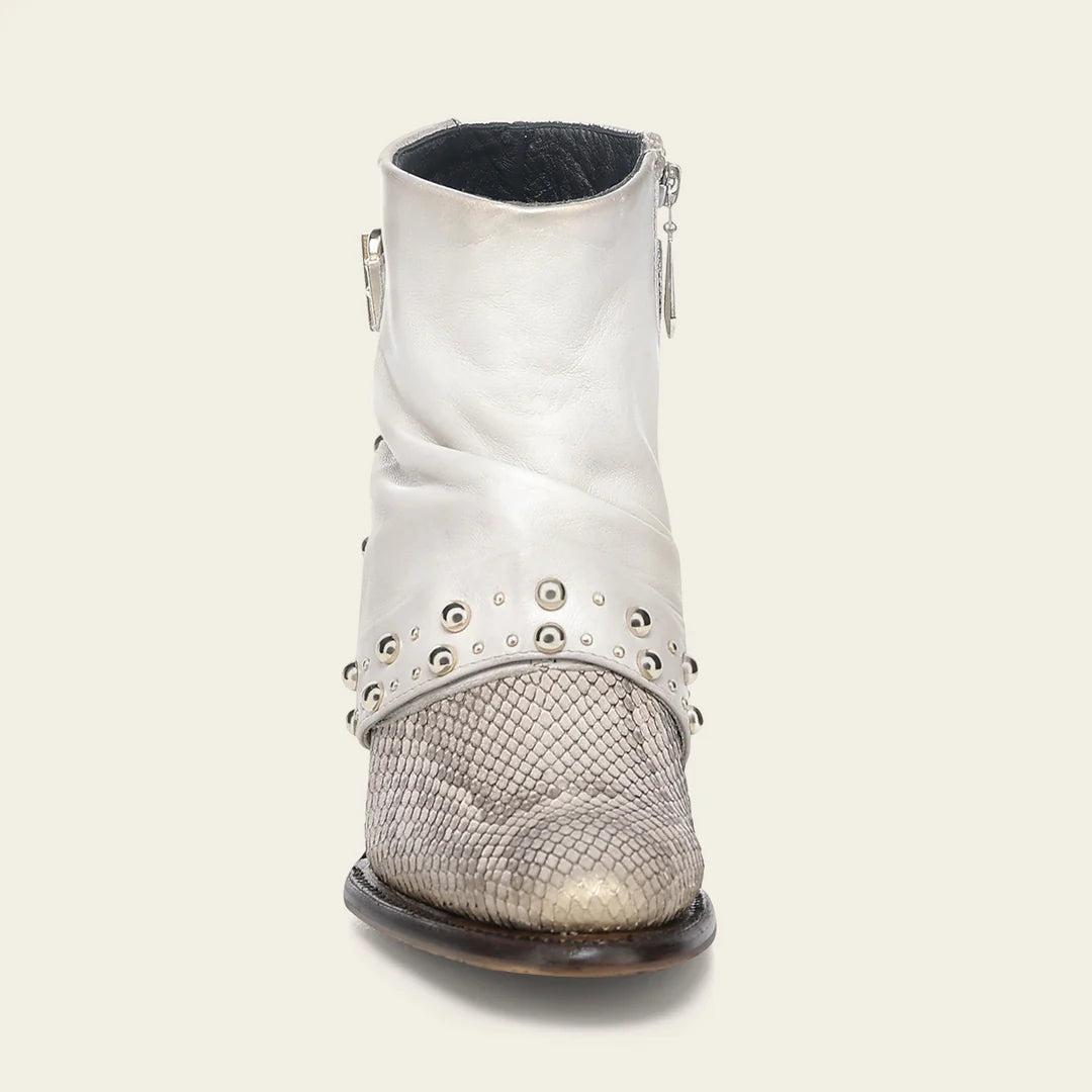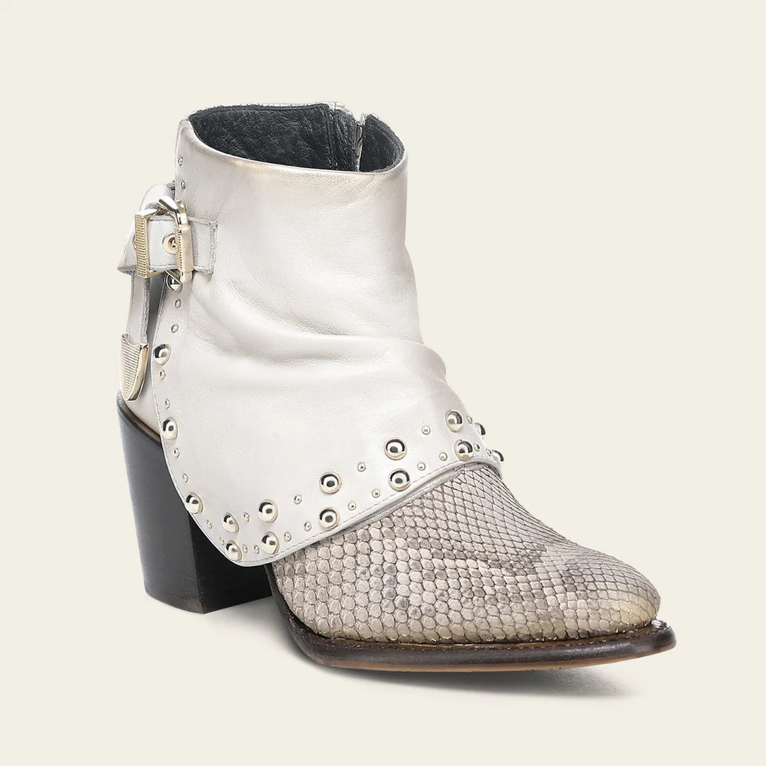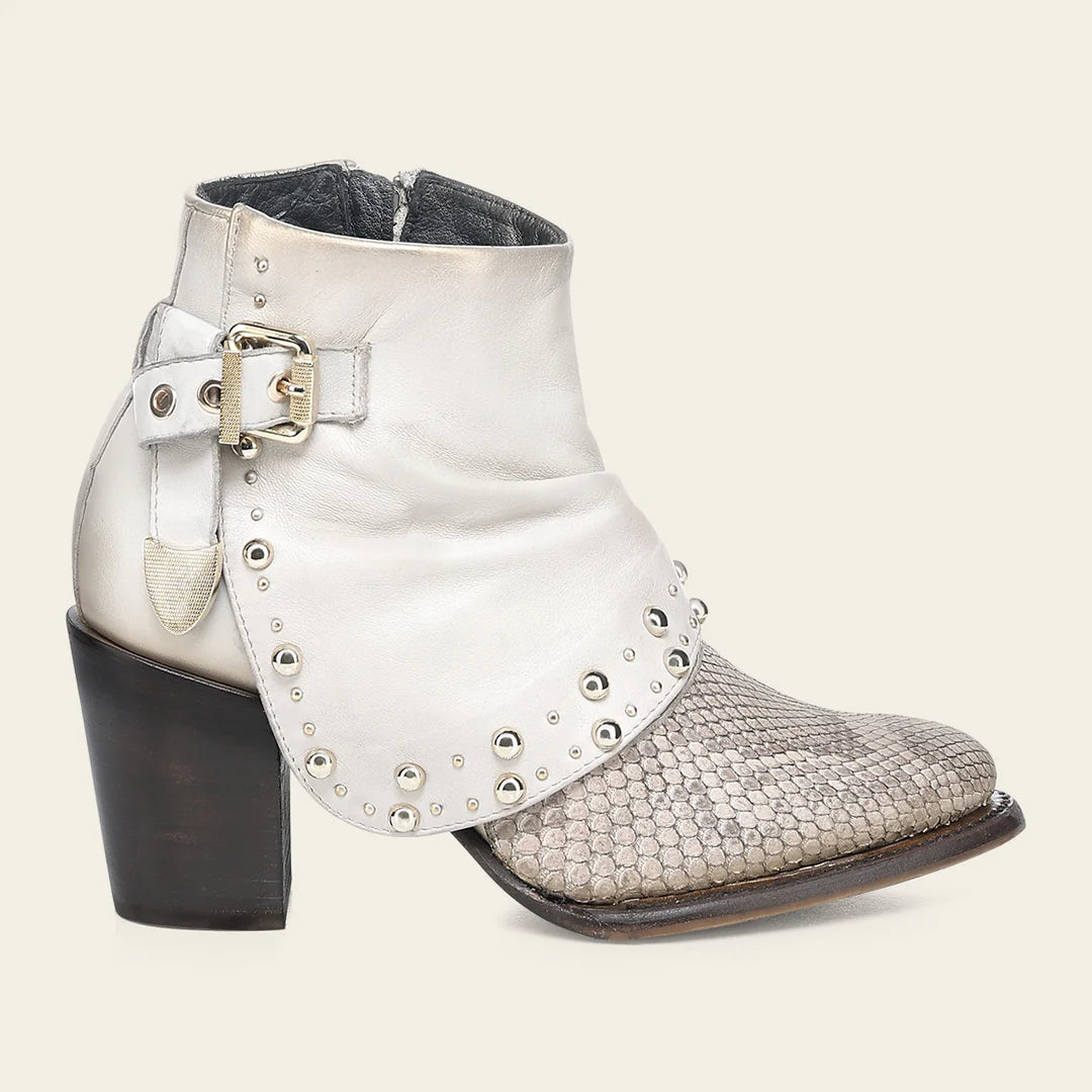 Botín para dama en piel genuina de pitón y piel de bovino. Presenta diseño plegable en la parte frontal con aplicaciones metálicas. Con una correa decorativa en la parte trasera sujeta con hebilla y acabado pintado a mano. Ajustado con cierre interno. Cuenta con las nuevas tecnologías: platilla flex removible, planta Ortholite, que le dan mayor ligereza, confort, transpirabilidad y amortiguación. Con suela de cuero con injerto de TPU.