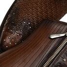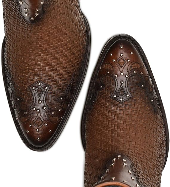 Presenta entretejido artesanal, estoperoles, bordado en la parte trasera y aplicaciones de piel en textura contrastante.