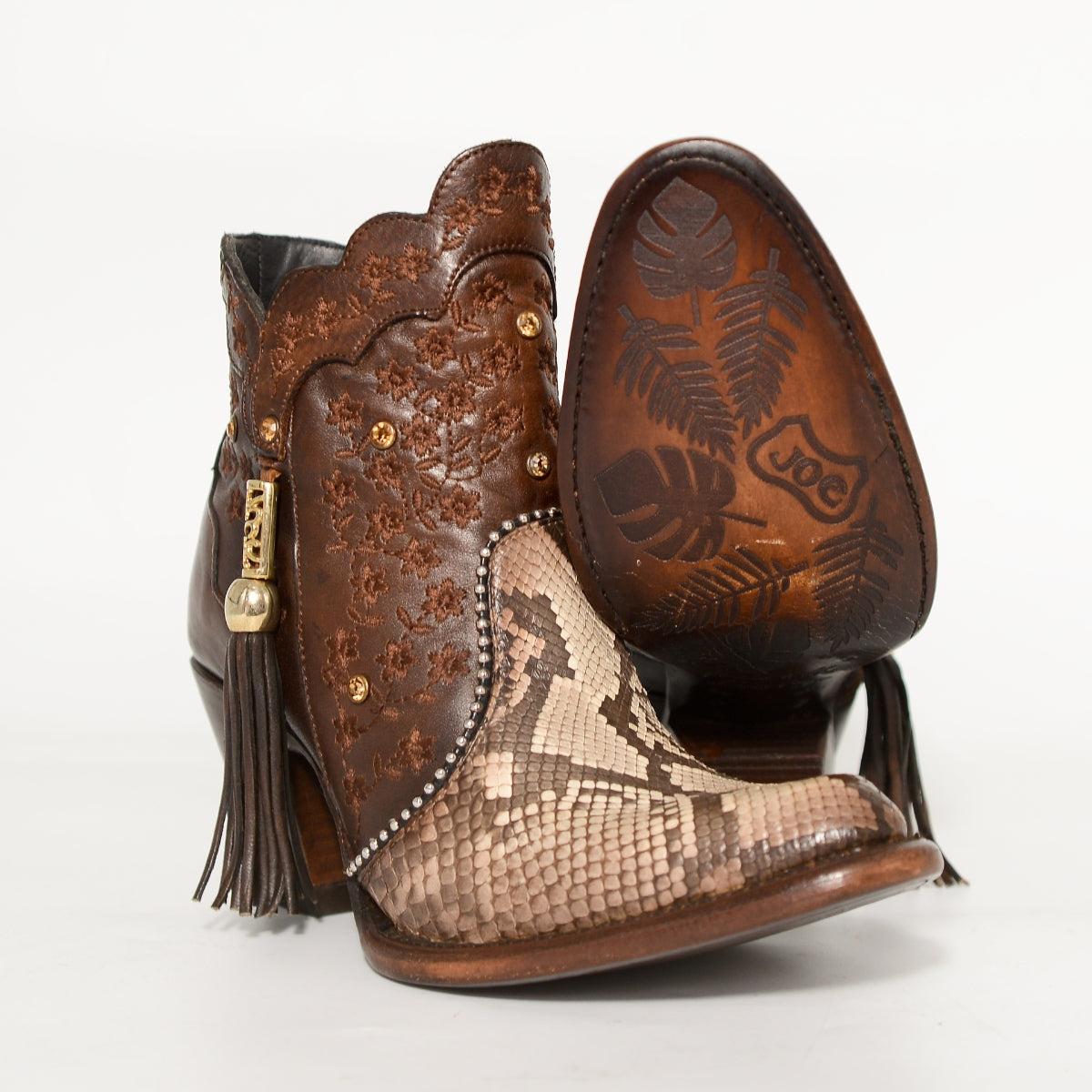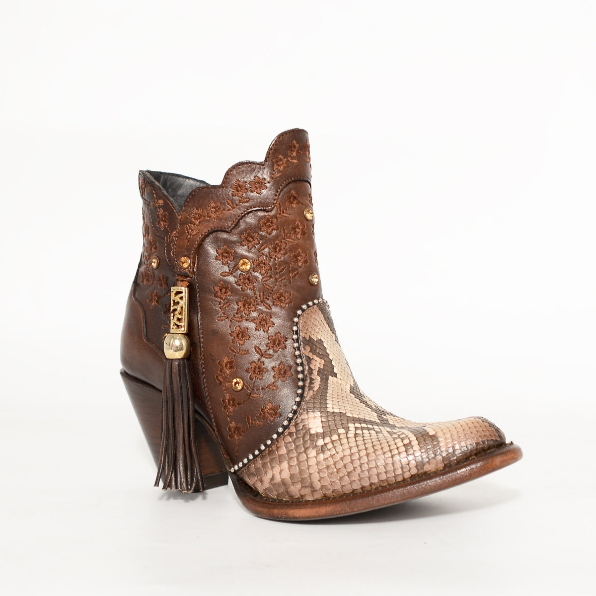 Bota vaquera corta para dama fabricada en piel genuina color café, con elegante combinación de bordados florales y punta en piel tipo pitón que resalta por su textura exótica. El diseño artesanal se complementa con detalles metálicos dorados y un adorno lateral con borla en piel, que aportan distinción y estilo único.