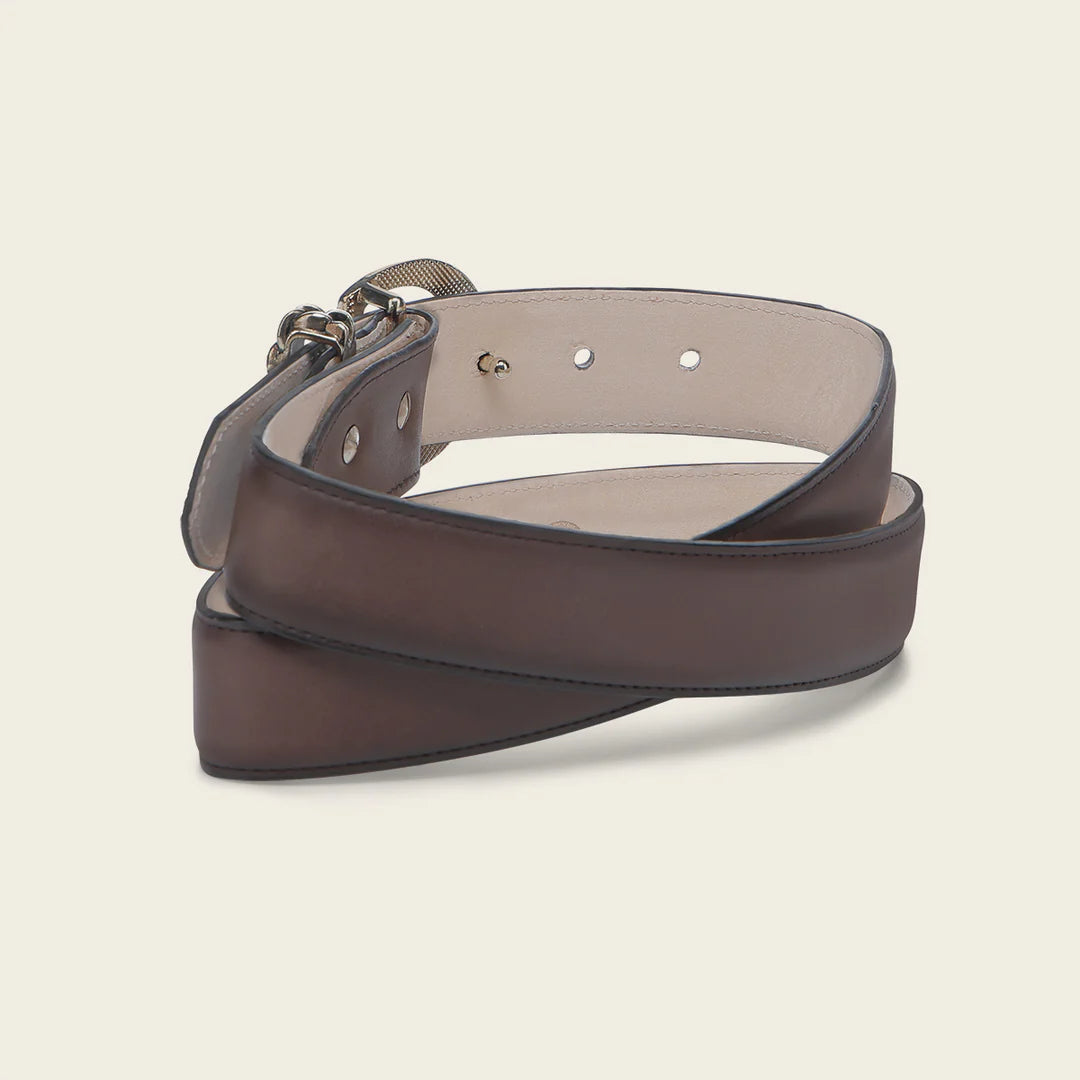 Cinturón para dama en piel genuina de carunga y piel de bovino. Hebilla de 33mm personalizada, con motivos de cadena. Con forro en piel de bovino.